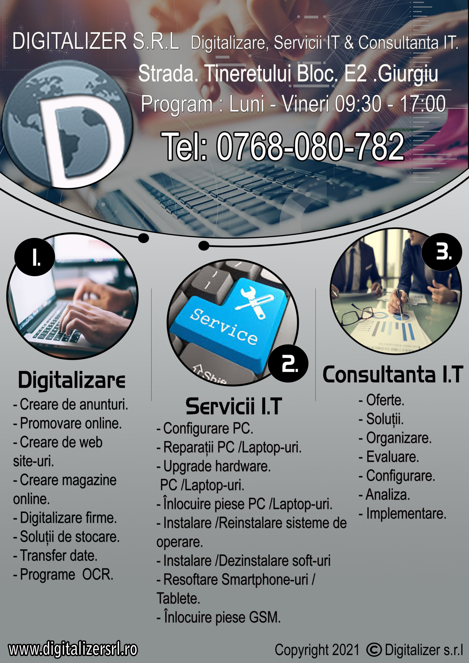 Obiectivul nostru este să oferim cele mai bune, mai ieftine și mai rapide servicii IT, din Giurgiu. Ne concentrăm pe soluționarea dificultaților întâlnite de dumneavoastră în cel mai scurt timp posibil. Orice solicitare este discutata împreună cu clientul pentru